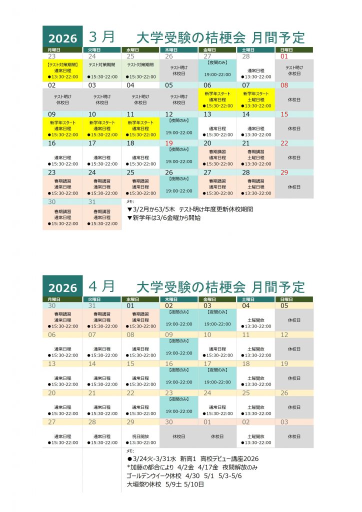 【月次スケジュール】2026年3-4月